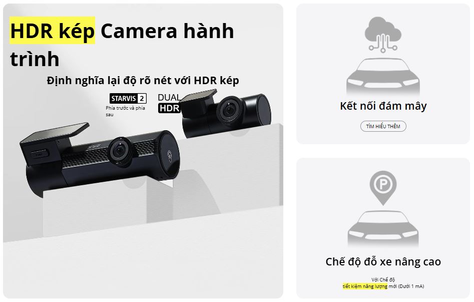 Nổi bật | 2K QHD HDR (Phía trước + Phía sau), Wi-Fi 2.4-5GHz, Đám mây (không bao gồm dữ liệu), Chế độ đỗ xe tiết kiệm năng lượng |