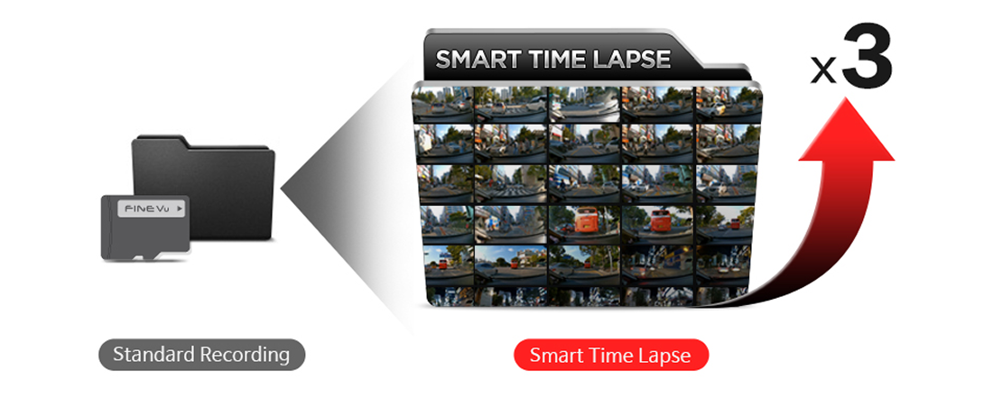 Tính năng SMART TIME-LAPSE ghi lại tối đa 169 phút mà không mất dữ liệu. Khi phát hiện va chạm,