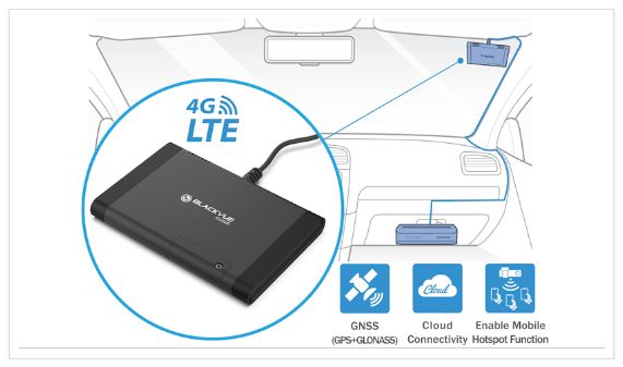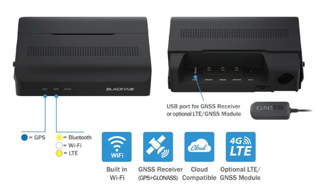 GPS bên ngoài (bao gồm):nhúng dữ liệu tốc độ và vị trí trong video của bạn. Điều này cho phép bạn theo dõi phương tiện của mình trong thời gian thực thông qua BlackVue Cloud và xem vị trí của nó trên bản đồ trong khi phát lại trong Ứng dụng BlackVue hoặc Trình xem. Wi-Fi:kết nối với BlackVue của bạn bằng điện thoại thông minh hoặc máy tính bảng để truyền tệp nhanh chóng. Wi-Fi cũng cho phép BlackVue của bạn kết nối với BlackVue Cloud bằng điểm truy cập Wi-Fi di động (bộ định tuyến). LTE:kết nối mô-đun kết nối LTE tùy chọn với cổng USB để có trải nghiệm Đám mây tốt nhất. (Tùy chọn, mua thêm) (*) Không bao gồm thẻ SIM.
