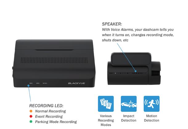 Loa:camera hành trình của bạn cho bạn biết khi nó bật, tắt hoặc phát hiện lỗi. Gia tốc kế:nằm ở camera trước, nó phát hiện các tác động để kích hoạt Ghi sự kiện. Bật Chế độ đỗ xe* khi đứng yên trong 5 phút. Tự động gắn thẻ các tệp video:Trong khi lái xe, gia tốc kế (cảm biến G) tích hợp sẽ phát hiện các tác động và thay đổi tốc độ đột ngột. Khi đỗ, BlackVue của bạn cũng phát hiện các chuyển động trực quan xung quanh xe của bạn (ở chế độ Phát hiện chuyển động + va chạm). Sử dụng các bộ lọc trong Ứng dụng và Trình xem BlackVue:BlackVue gắn thẻ tất cả các video (Bình thường, Sự kiện, Chế độ đỗ xe, v.v.), để bạn có thể lọc chúng và nhanh chóng tìm thấy những video bạn cần trong Trình xem BlackVue (Windows, Mac OS, Web ) hoặc Ứng dụng BlackVue (Android, iOS). (*) Cần đấu Bộ chế độ đỗ xe hoặc Pin.