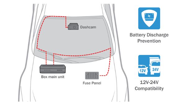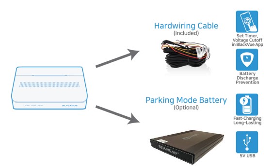 Cáp nối cứng đi kèm DR770X Box Series có thể được nối cứng vào bảng cầu chì trên xe của bạn cho Chế độ đỗ xe mà không cần phụ kiện tùy chọn. Camera hành trình sẽ tự động chuyển sang Chế độ đỗ xe khi tắt đánh lửa xe. Ngắt điện áp và hẹn giờ có thể được đặt trong Ứng dụng BlackVue. Hỗ trợ các phụ kiện Chế độ đỗ xe DR770X Box Series cũng tương thích với tất cả Pin và Bộ công cụ chế độ đỗ xe BlackVue.