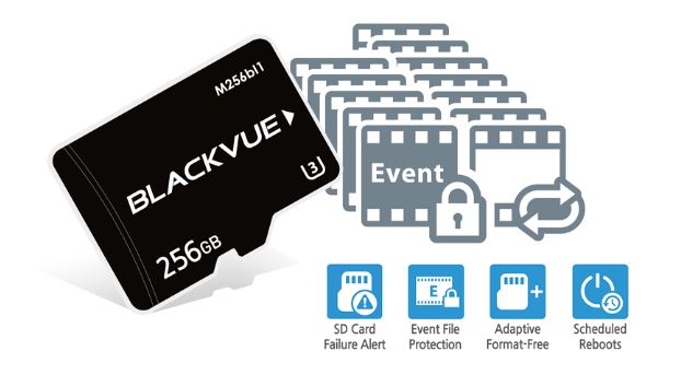 Bảo vệ ghi đè tệp sự kiện:camera hành trình ghi hình trong một vòng lặp, ghi đè lên các tệp cũ hơn khi bộ nhớ đầy. BlackVue có thể ngăn ghi đè các tệp Sự kiện (được kích hoạt thủ công hoặc do tác động). Có thể bảo vệ tối đa năm mươi mốt (51) tệp theo cách này (17 phút Trước/Sau/Nội thất). Bạn có thể chọn cho phép các tệp Sự kiện mới ghi đè lên các tệp Sự kiện trước đây, do đó giữ lại 51 tệp mới nhất. Quản lý tệp không có định dạng thích ứng:hệ thống tệp do BlackVue phát triển này cải thiện độ ổn định của bản ghi và yêu cầu định dạng thẻ nhớ microSD ít hơn. Cảnh báo lỗi thẻ SD:BlackVue của bạn sẽ phát hiện ngay khi thẻ nhớ microSD bị lỗi và cảnh báo bạn bằng cảnh báo bằng giọng nói “Vui lòng kiểm tra thẻ SD”.